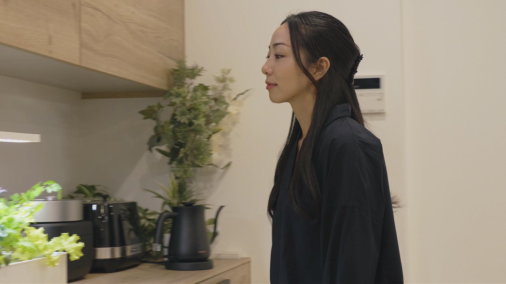 当製品では他の観葉植物のようにインテリアとしての鑑賞に耐えるデザインを目指しました。場所を選ばず馴染みやすいシンプルなデザインに。上部照明もLEDを集約しコンパクト化したことで植物鑑賞の邪魔にならず、かつ収穫時に切りやすくなりました。先述の通り照明の明るさも調整可能で、光の質もリビング等の室内灯に合わせやすいものとなっています。